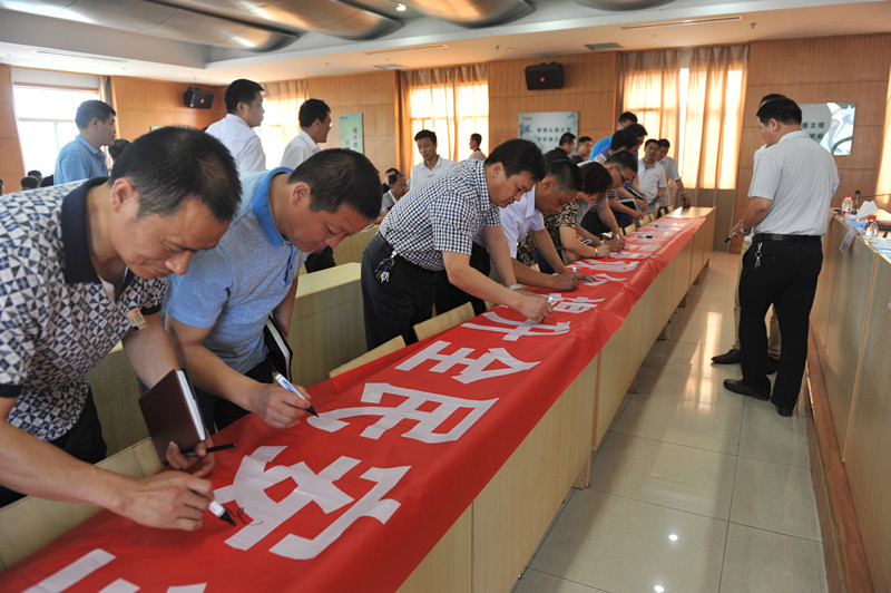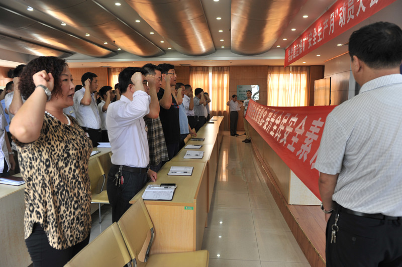 安全副矿长田玉春带领与会人员进行了安全宣誓,并在安全月主体条幅上进行了集体签名。