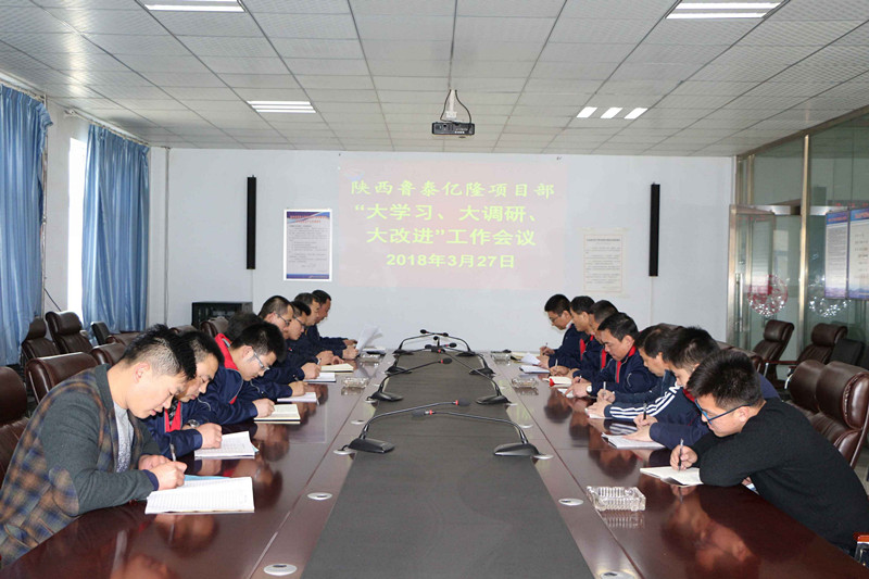 3月27日下午,陕西鲁泰利用周二"两学一做"学习教育日,组织百吉、亿隆、海则庙三项目部开展了"大学习、大调研、大改进"工作会议,深入贯彻全市、市国资委和集团公司"大学习、大调研、大改进"工作会议精神。项目部中层及以上管理人员、党员和部分职工参加了会议。