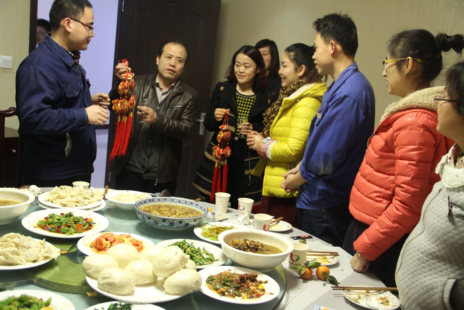 公司董事长、党委书记肖作飞,纪委书记、工会主席吴艳蕊、副总经理张红艳等与大家围坐在一起,共迎新春。肖作飞代表公司领导班子向青年职工们以及节日期间坚守在自已的工作岗位上的广大职工送去新年的祝福!并为职工发放了"福包",祝福大家在新的一年里年年有"鱼"!万事如意!