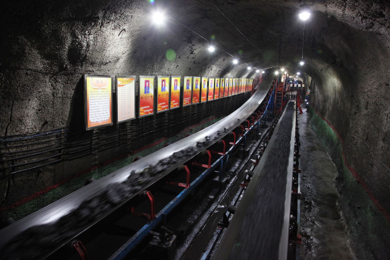 我们现在走的是轨顺,你问我为什么那么多棚头、棚腿,有的还弯了,这就是我们工作面的特性造成的因为它周围压力大,所以需加密,运顺比这还多。